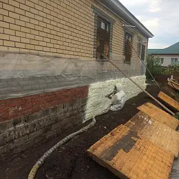 - Задача: напыление ППУ для утепления фундамента дома с последующей гидроизоляцией полиуретановой мастикой ручного нанесения
